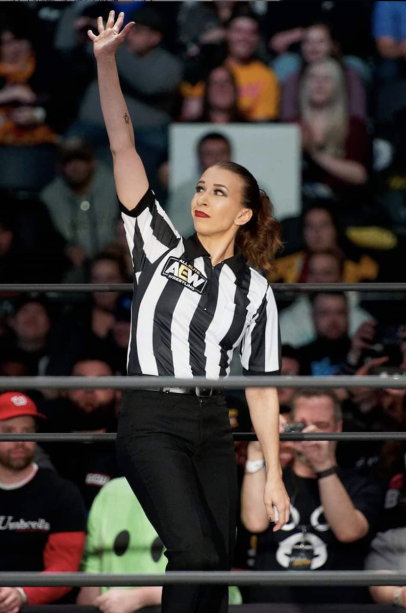 "Me enteré que ésta persona está presente ahora mismo en el backstage, así que quiero invitarla a que pase al ring para discutir esta situación" dice MJF, invitando a la oficial Edwards al ring.